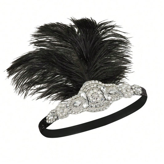 Sort Pandebånd med Fjer og Perler i 1920'er Gatsby Retro Stil