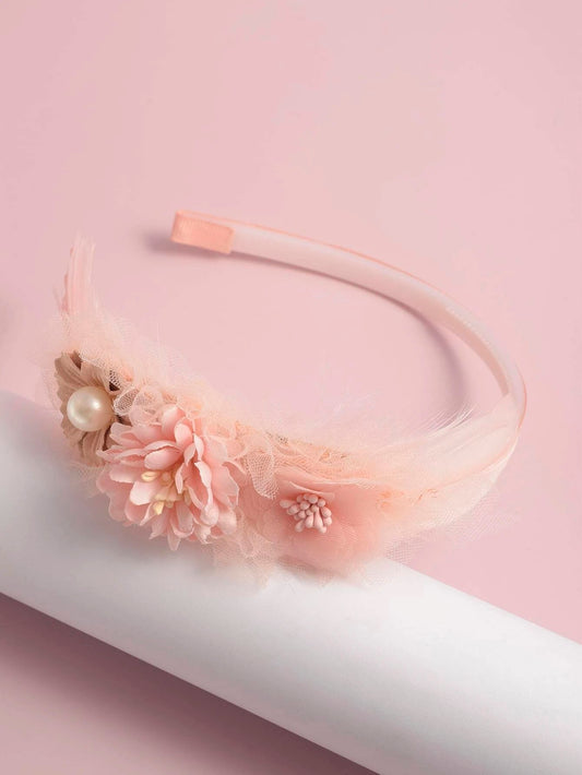 Smuk Hårbøjle med Blomster & Fjer - i Lyserøde Farver