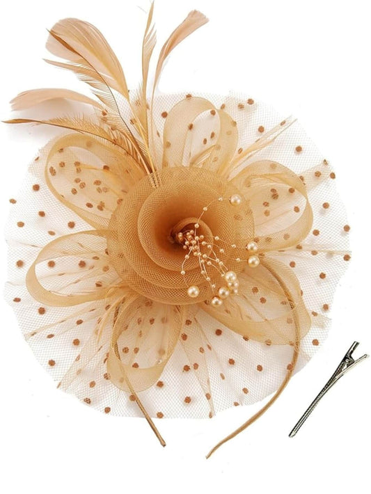 Gylden Hatinator Hårpynt med Blomst, Perler, Fjer & Net