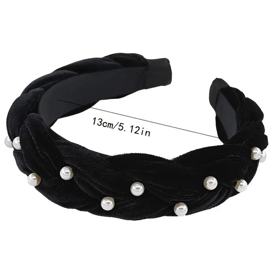 Sort Velour Hårbøjle i Flettet Design med Store Hvide Perler