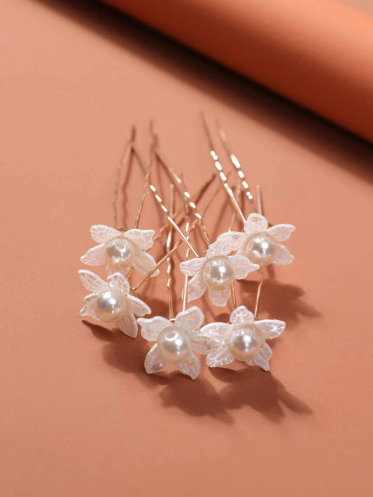 6 stk Gyldne Hårnåle med Hvide Perle Blomster