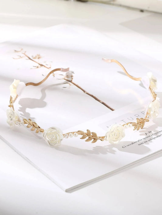 Gylden Hårbøjle - Diadem med Roser & Perler