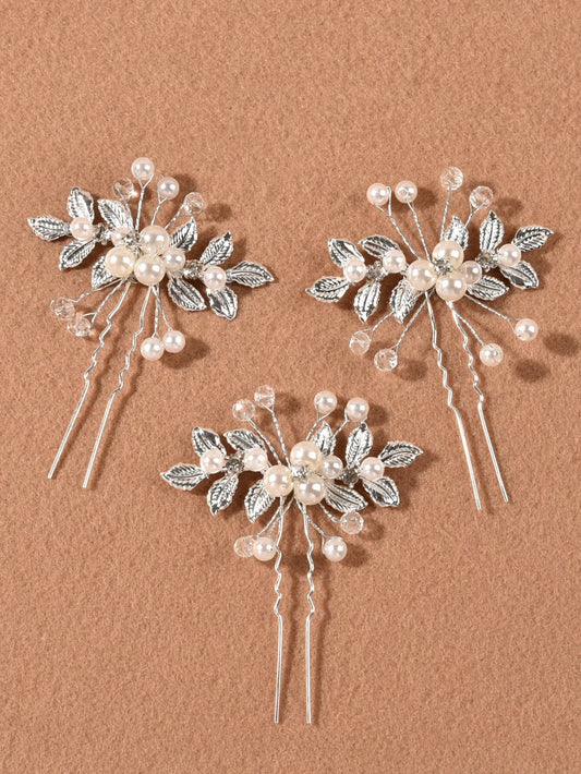 3 Stk Sølv Hårnåle med Blomster, Blade og Perler
