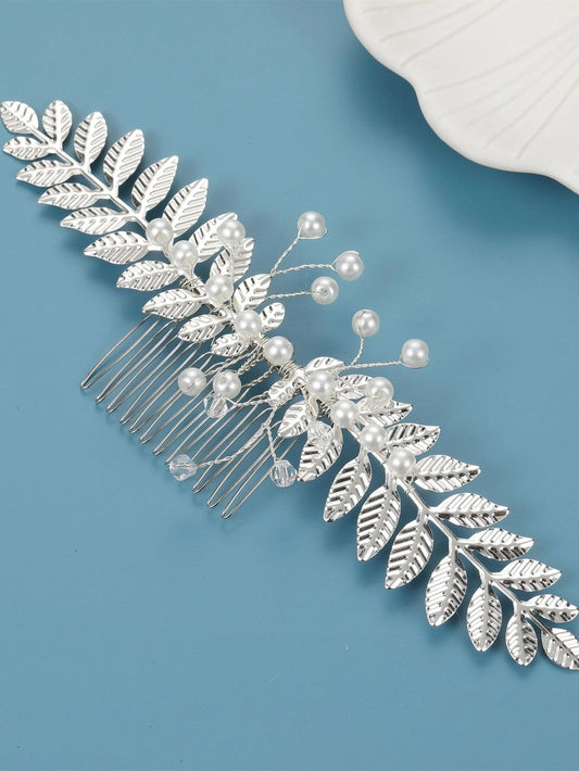 Stort Hårsmykke - Sølvkam med Blade & Hvide Perler