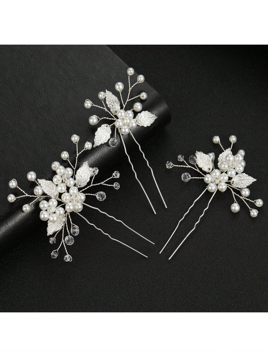 7 Stk Hårnåle med Sølv Blade og Hvide Perler