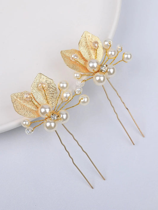 2 Stk Hårnåle med Blomst, Gyldne Blade og Perler