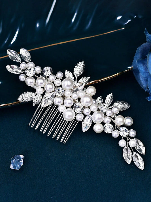 Stort Hårsmykke med Hvide Perler, Sølv Blade & Krystalperler