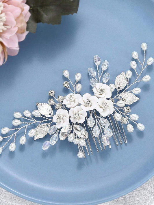 Sølv Hårsmykke med Hvide Blomster & Krystalperler