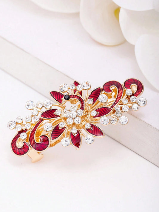 Gyldent Patentspænde med Rød Påfugl & Krystalperler