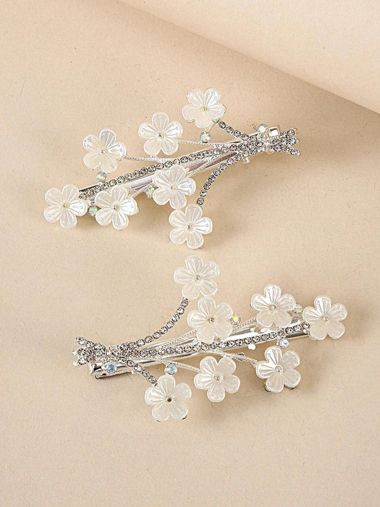 Sølv Hårspænder med Hvide Blomster og Krystalperler