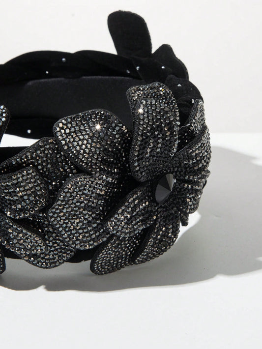Sort HÄrbÞjle med Store Perleblomster - i Polstret Sort Flettet Velour med Perler