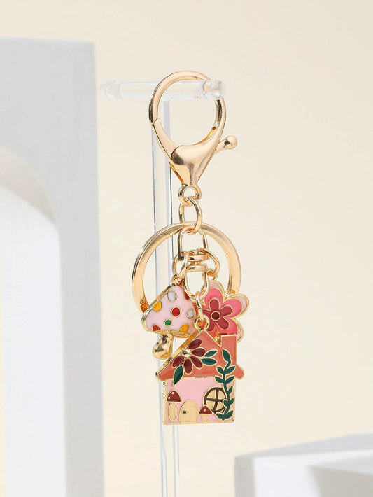 Gylden Nøglering med Hus, Paddehat & Blomst