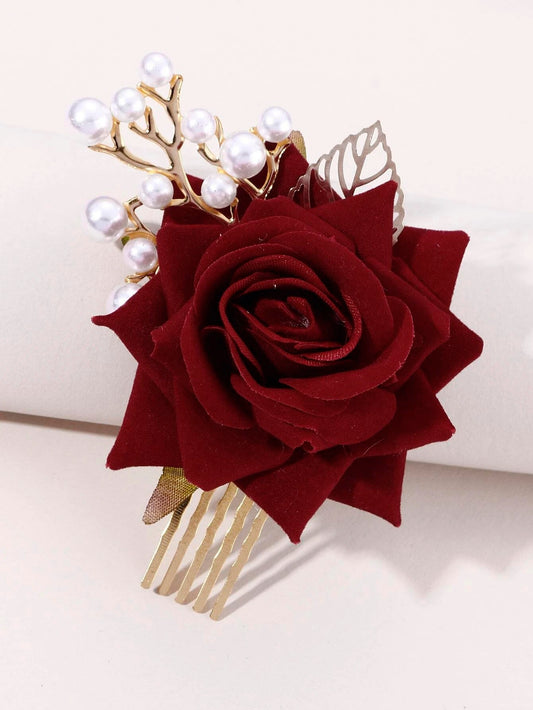 Mørk Rød Rose med Gyldent Blad & Hvide Perler