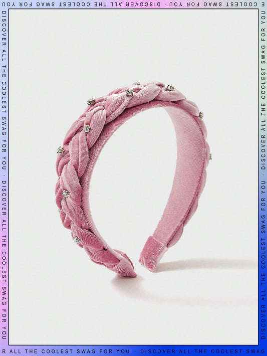 Rosa Velour Hårbøjle i Flettet Design med Klare Perler