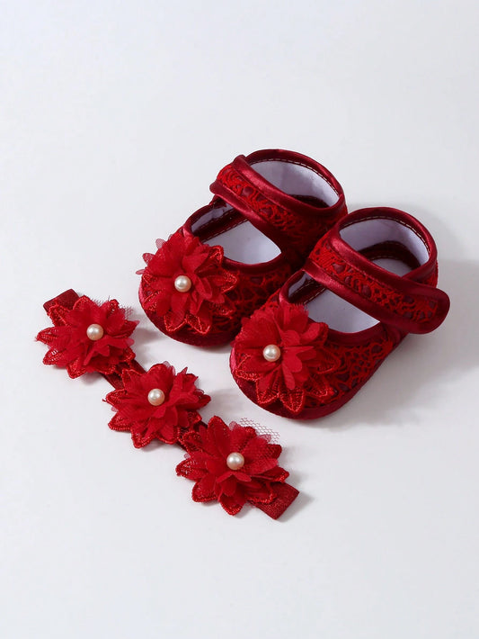 Baby Hårbånd & Sko med Blomster - i Mørk Rød
