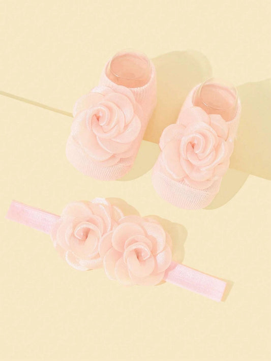 Baby Hårbånd og Sko med Roser - i Lyserød