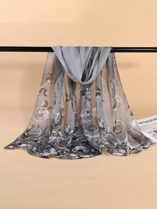 SølvGrå Chiffon Tørklæde med Roser