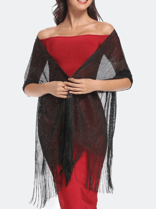 Sort Tørklæde - Sjal med Glans, Frynser & Spænde