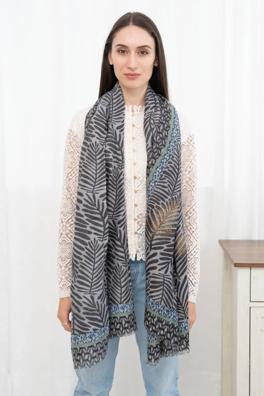 Stort Tørklæde med Bomuld - i Sort Bladprint & Guld