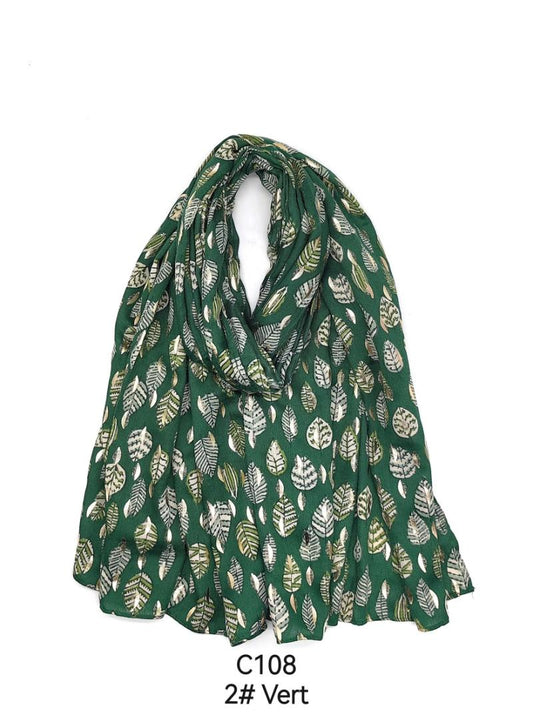 Stort Tørklæde med Bomuld - i Grønt Bladprint & Guld