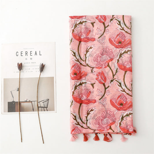 Stort Tørklæde - Fint Valmueprint i Rosa Farver & Kvaster