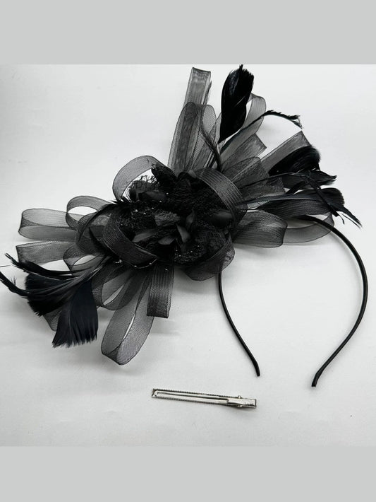 Black Fascinator Hair Accessory with Flower, Bow & Net