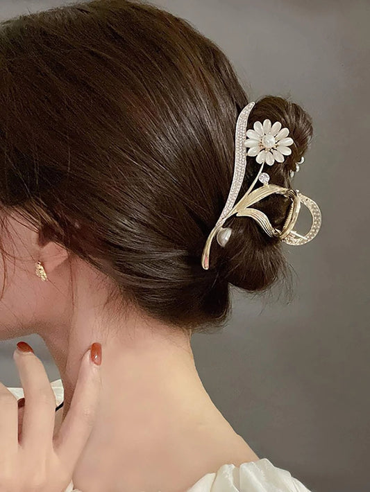 Golden Metal Hair Clip with Flowers & Pearls