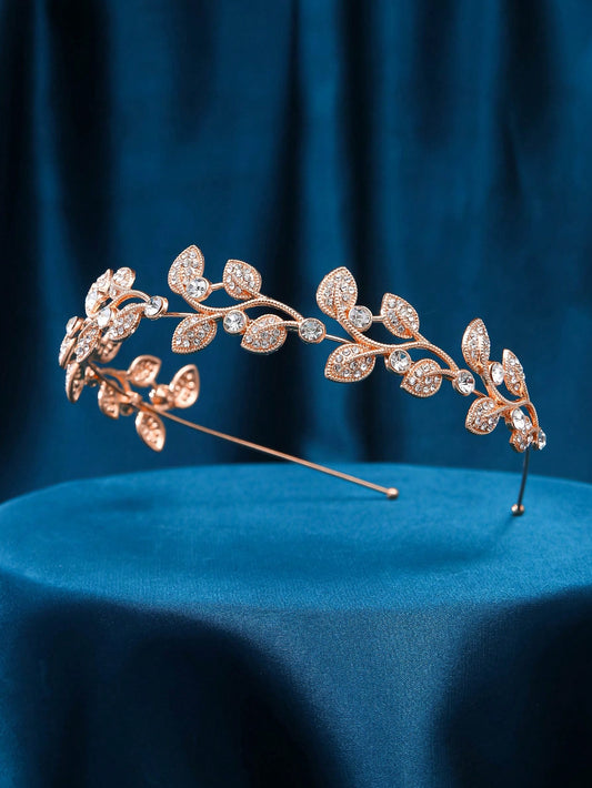 Hairband (Tiara) with Leaves & Crystal Beads - in Rose Gold