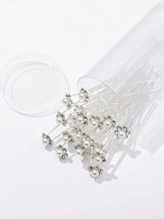 20 pcs Silver Hairpins with White Pearls & Crystal Beads