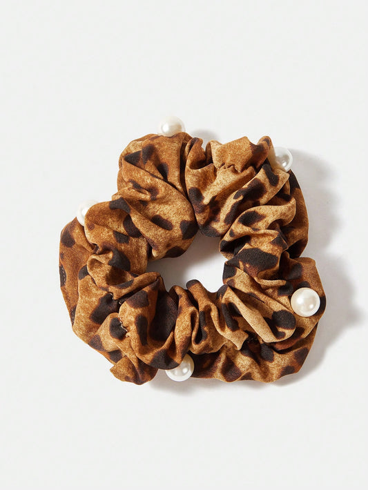 Large Brown Scrunchie Hair Elastic in Leopard Print with Beads