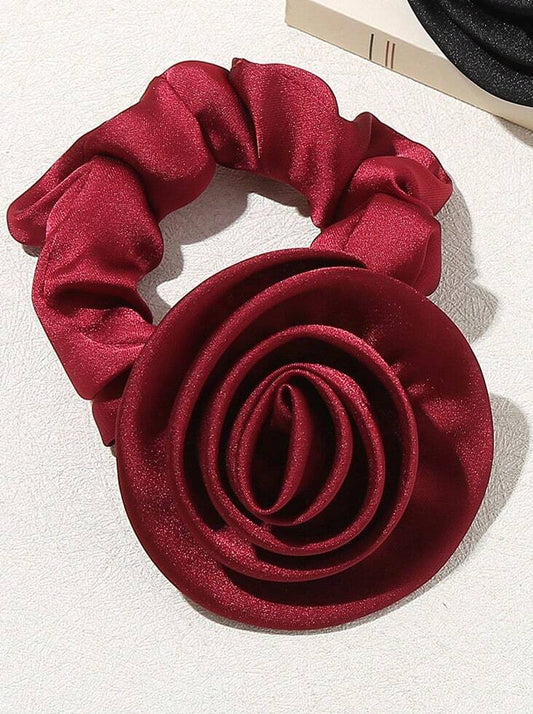 Satin Scrunchie Hair Elastic with Rose - in Red