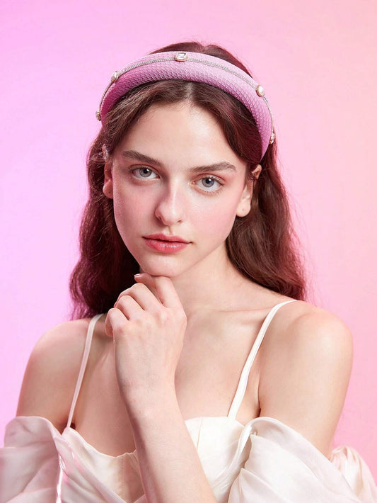 Pink Padded Hairband with Crystal Bead Ribbon