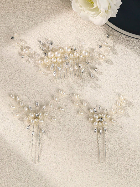 Hair Ornament & 2 Hairpins - with White & Clear Pearls