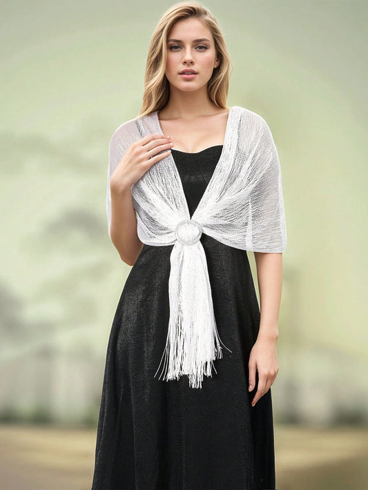 White with Silver Glitter Scarf - Shawl with Fringes & Buckle