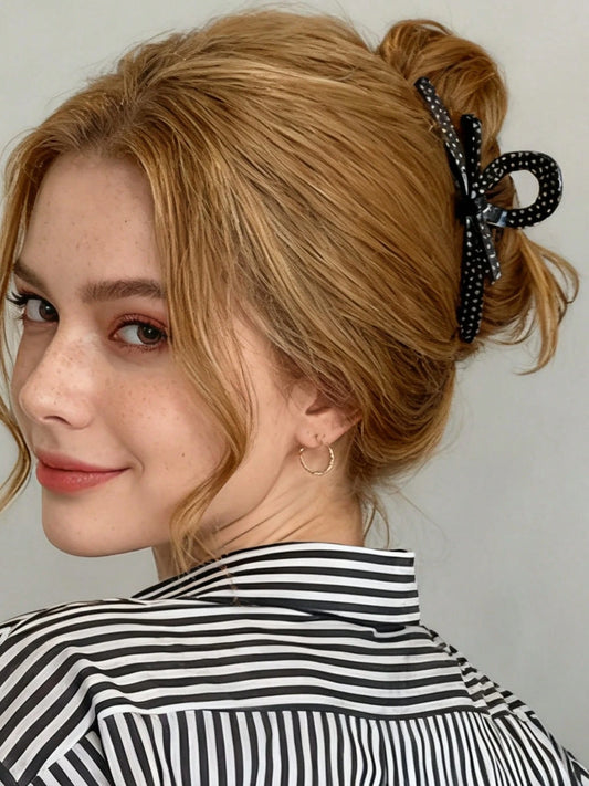 Black Hair Clip in Bow Design with White Dots